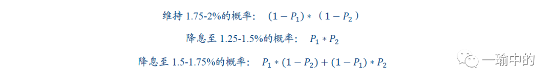 3. Fed watch的计算方法:多次议息会议后的调息概率分布在上述四种情况中,我们的计算结果只是单次议息会议美联储维持利率不变或调整利率的概率,有时候,我们想要知道在多次议息会议后美联储将FFR定在某一个目标区间的概率。所以我们在得到单次降息概率后,需要再进一步,计算FFR目标区间的概率分布。以计算12月议息会议后FFR目标区间概率分布为例。9月议息会议后,FFR目标区间为1.75-2%,10月和12月分别有一次议息会议(出于简便和实际考虑,我们假设10月和12月议息会议只有降息或者维持利率两种可能),所以12月议息会议结束后,FFR目标区间会有三种情况:1.75-2%,1.5-1.75%,1.25-5%。三种情况分别的概率为:![]()