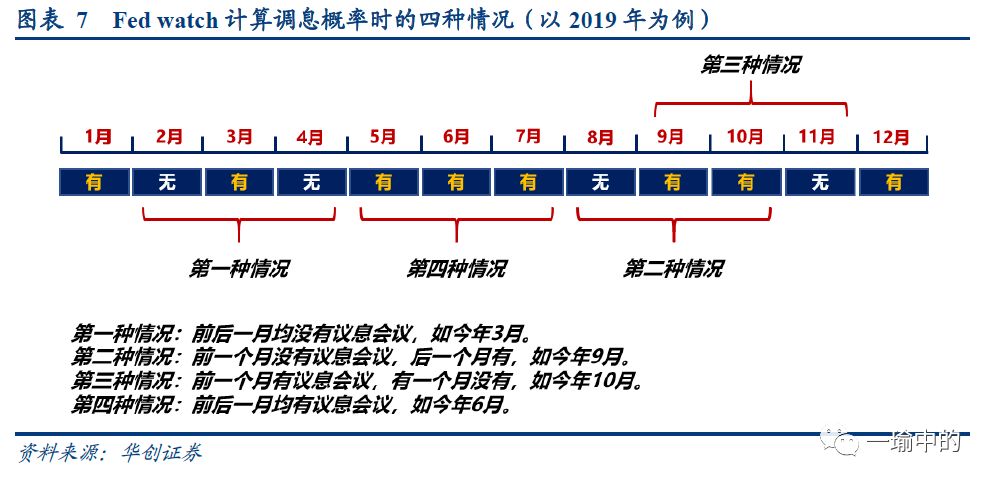 根据会议月份前后一个月有无议息会议,我们可以将Fed watch计算调息概率的情况分为四种(以2019年为例):![]()