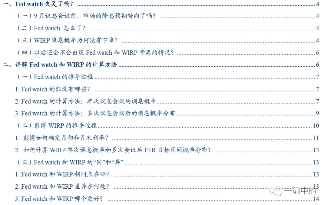 在9月18日议息会议召开前一周,Fed watch降息概率大幅下降至50%,而WIRP降息概率仍然保持在100%。一时之间市场惊诧声四起,我们认为市场的核心关注点在三个问题:第一,以Fed watch衡量的市场降息预期为何在短期内大幅转向?第二,Fed watch和WIRP为何会产生如此大的背离?第三,以后还会不会出现这种背离的情况?