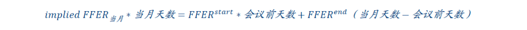 这是Fed watch和WIRP计算降息概率的核心公式。FFER表示联邦基金有效利率(Federal Fund Effective Rate),纽约联储每天会公布这一利率[1]。而联邦基金期货的报价方式为:100-联邦基金每日隔夜利率的算数平均值,所以期货价格就隐含了市场对FFER日度平均值的预期,我们称之为Implied FFER。当月的Implied FFER可用于推算计算调息概率时所需的FFER(start)、FFER(end)。