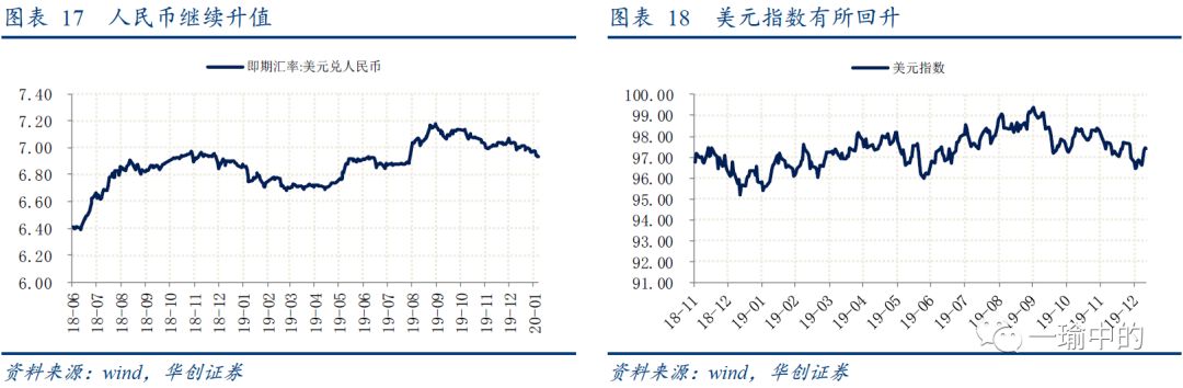 1月10日USDCNY即期汇率报6.9290,相比上周升值0.61%。美元指数1月10日报97.3752,较上周升值0.5%。中方正式确认国务院副总理刘鹤将于本月13-15日率团访问华盛顿,与美方签署第一阶段经贸协议,中美贸易关系持续缓和利好人民币持续升值。而中东局势未进一步升级,双方在表态与行动上也较为克制,美元指数也略有回升;但周五公布的美国非农数据大幅低于预期,美元指数随后下跌。![]()