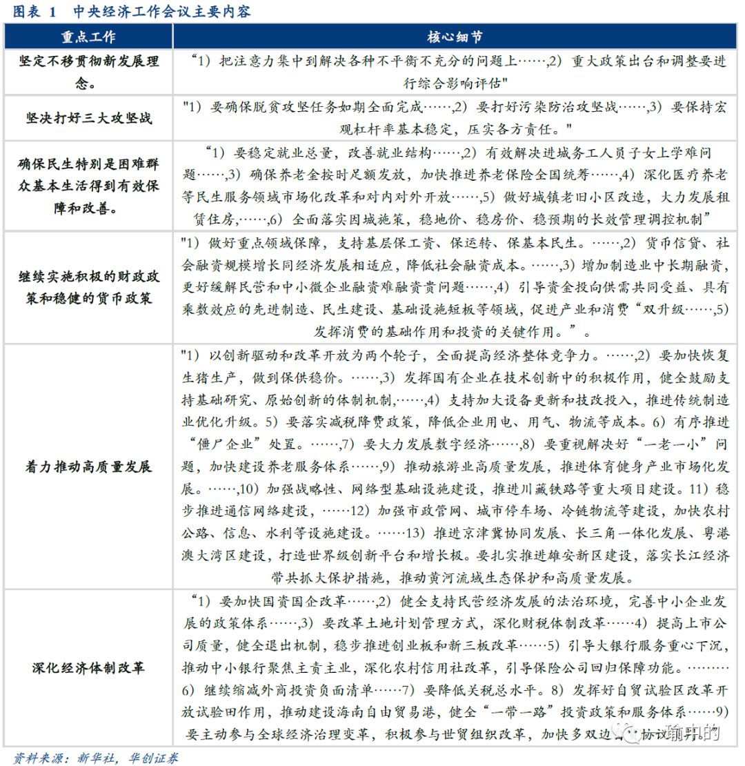 一、回顾:2019年中央经济工作会议部署了哪些任务?中央经济工作会议明确部署了六大任务,涉及细分子任务将近40个。涉及财政、金融、产业发展、民生保障、对外开放、经济体制改革、三大攻坚战、基础设施建设、区域协调发展等。按往年经验,以政治局会议和中央经济工作会议为纲,“所念”之项,皆会在部委年度落实会议中“有响有应”,因此,梳理各部委的年度工作会议,可从中厘清2020年政府工作的主线。