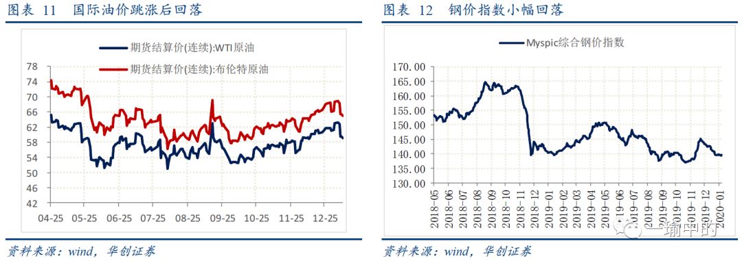 生产端,发电耗煤量、高炉开工率环比回落,全钢胎、半钢胎开工率回升。其中,6大发电集团日均耗煤量72.41万吨,周环比下降3.49%,同比下降6.63%。全国高炉开工率报66.57%,环比略降0.14%,同比回升3.43%。汽车全钢胎、半钢胎开工率分别录得71.79%、70.13%,环比分别提升12.14%、0.57%。生产端来看,1月第二周生产活动略有降温。价格端,国际油价跳高后回落,钢铁、水泥价格小幅下跌。国内南华工业品指数继续提升,收于2362.97,环比上升0.48%;但Myspic综合钢价指数收于139.48,环比下降0.20%;全国水泥价格指数录得165.36,环比下降0.33%;或与第二周生产活动略有降温相匹配。![]()