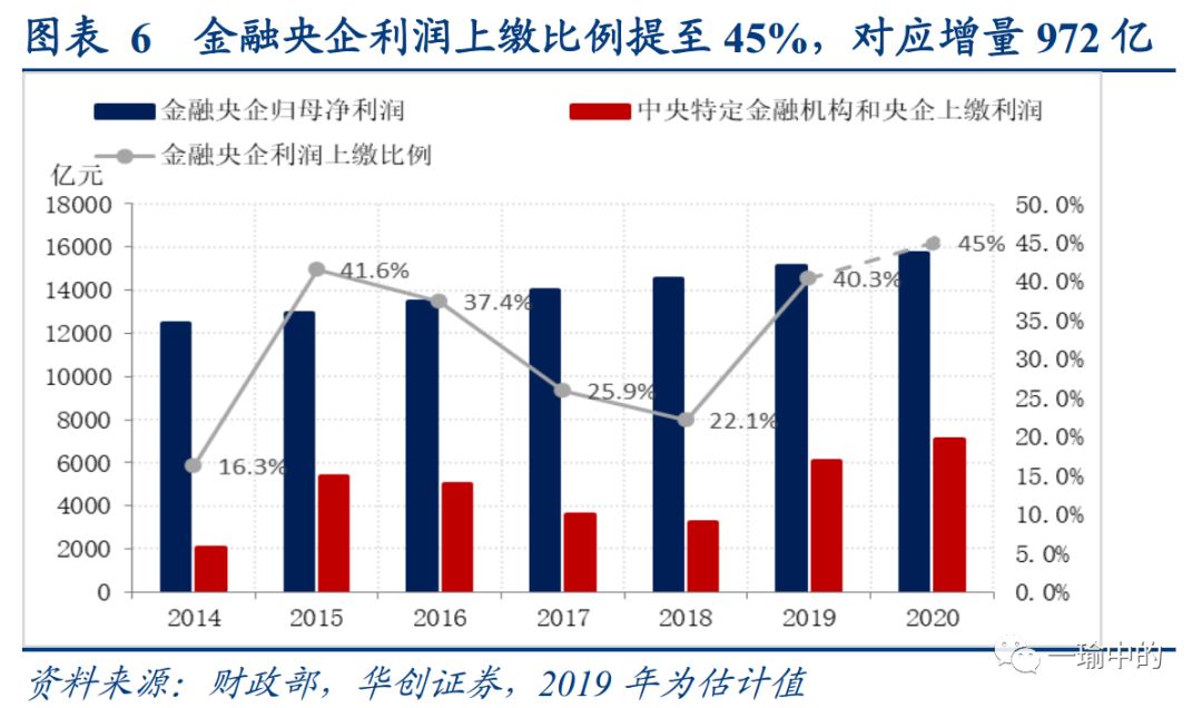 由于金融国企利润上缴概念范围始终不清,数据质量相对有限,以最为接近的非税收入子项目——国有资本经营收入(其中仍可能包括部分非金融央企利润)为代表衡量。假设2013-2017年金融央企归母净利润年复合增长率不变[5],若今年将中央特定金融机构和央企上缴利润比例由2019年的40.3%提至历史新高45%,同时地方金融国企上缴水平保持不变,对应增量为972亿。