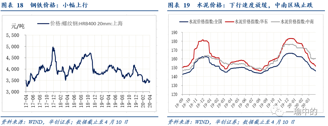反映项目施工情况的数据较多,较为重要的有螺纹钢的库存、开工率、价格;水泥的开工率、价格;挖掘机的销售、挖掘机利用小时数等几个指标。3月的挖机销售进一步超预期,挖机利用小时同比收窄至-16%左右,显示3月实际施工情况恢复较好。预计4月上旬建筑业复工率基本能达到九成以上。从目前周度的高频数据看,螺纹的开工率在持续上行,螺纹价格基本止跌,螺纹的库存每周下行60-70万吨左右,水泥开工率持续上行,部分区域的水泥价格开始止跌。预计基建投资增速单4月同比实现正增长,甚至可能接近两位数。