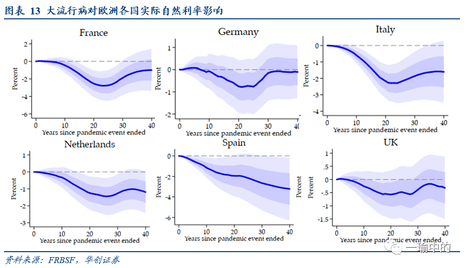 旧金山联储(FRBSF):流行病的长期经济后果。研究了14世纪以来的15个主要大流行病(死亡人数超过10万)对欧洲主要国家实际自然利率的冲击。研究表明,大流行病的宏观影响可持续40年之久,它导致实际利率大幅下降。与此形成对比的是,战争并没有这样的后果,相反,战后会导致实际回报率上升。若新冠疫情造成的影响与历史上的大流行病类似,那么全球经济的发展轨迹将与之前的悲观预期大相径庭:如果低实际利率持续几十年,它们将为各国政府提供可喜的财政空间,以减轻这一流行病的后果。