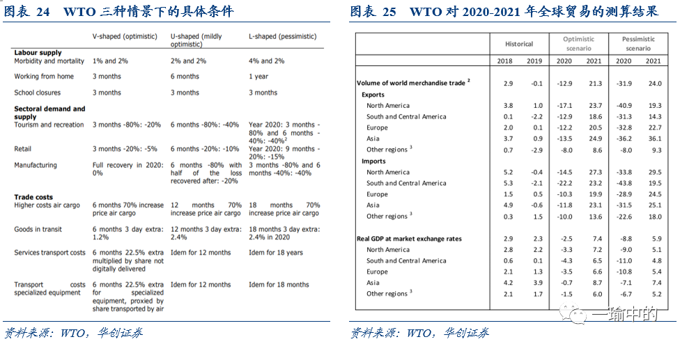 世界贸易组织(WTO):2020年4月8日全球贸易预测。2020年,世界商品贸易量降幅可能会超过全球金融危机导致的贸易衰退,降幅为13%到32%。对2021年预期复苏的估计有很大不确定,其结果在很大程度上取决于疫情持续时间和政策应对的有效性。