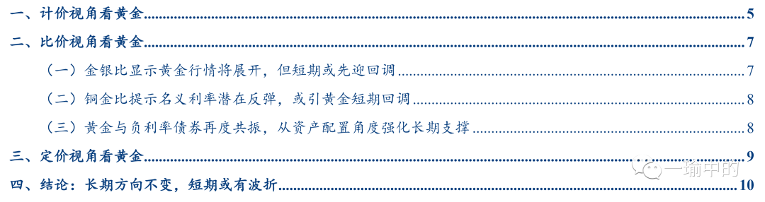 近期黄金创新高的关键要素之一在于美元指数破位下跌,而美元破位的关键性,在于其很可能已确认了新一轮美元长熊的周期背景。美元破位主要归咎于欧元强势。本次黄金突破历史新高与欧元尝试突破2008年以来下行轨道同时发生,因黄金和欧元处于同一阵营,避的都是“美元避不了的险”——美国经济相对走弱与美元信用削弱的风险。短期我们认为欧强美弱的格局将继续推动美元被动贬值,但美元仍存阶段性波动走强可能。更关键的是,本次美元破位很可能已确认了美元新一轮长熊的周期背景,而弱美元环境向来是黄金乃至大宗商品整体开启长期牛市的基础。财政与贸易“双赤字”的加剧是美元长熊的基本面催化剂。黄金的商品属性与资产属性,可以通过与其他商品与资产的比价显现,成为衡量行情的相对标尺:比起“金银比还能修复多少”,我们更关注“金银明确修复了”对黄金后市的方向与择时意义。结合历史复盘,我们认为金银比修复进一步确认了本轮行情的长期方向,但短期金银比遇阻反弹的概率增大,黄金可能将先迎回调。(二)铜金比提示名义利率潜在反弹,或引黄金短期回调铜金比与10年美债收益率同步性极佳。近期铜金比未能有效跌破历史低点、已经率先反弹,后续美债收益率的潜在反弹可能引发黄金短期回调。(三)黄金与负利率债券再度共振,从资产配置角度强化长期支撑金价走势与全球负利率债券规模再度形成共振,显示黄金有来自配置盘的长期增量资金支撑。相较2019年,本轮负利率债券扩张的最大背景变化是美国实际利率转负,处于实施负利率政策的边缘,意味着负利率债券空间巨大。普遍的负利率环境对黄金意味着什么?一是黄金长期被诟病的机会成本几乎消失,二是相对于提供负收益的债券,不生息的黄金反而成为了“有息资产”,使其从资产属性上发生了根本性变化。这意味着原先配置其他资产类别的增量资金可能涌入金市,对黄金走势构成长期支撑。黄金的长期定价组合:“名义利率长期低位+通胀预期长期上行”的潜在组合将引导实际利率持续走低,黄金也有望打开崭新的上行空间。黄金的短期定价组合:“名义利率潜在反弹+通胀预期进入博弈阶段+实际利率破位需确认”显示黄金短期或有回调需求。黄金创新高的过程未见明显透支,三“价”马车显示黄金长期前进方向不变,短期或有波折。长期来看,无论是计价角度美元破位与“双赤字”加剧对美元长熊周期背景的确认、比价角度金银比修复对行情后续展开的支持、负利率债券规模扩张对黄金资产配置逻辑的强化,还是“名义利率长期低位+通胀预期长期上行”长期定价组合的巩固,都显示黄金上涨逻辑完好,行情确定性边际增强。但短期不可忽略:比价角度金银比修复或遇阻反弹、铜金比提示美债收益率潜在上行风险,定价角度通胀预期修复进入博弈阶段、实际利率破位下行仍需确认。提示黄金短期或有回调风险,涨幅预期不宜过高。
