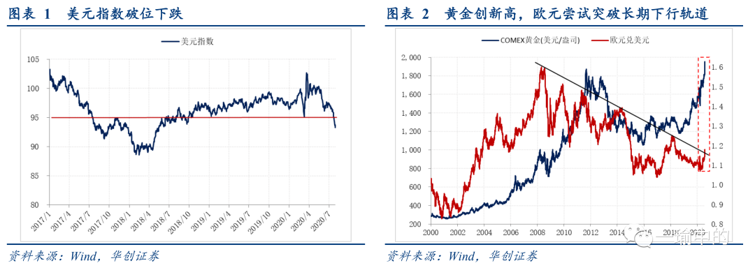 美元破位主要归咎于欧元强势。本次黄金突破历史新高与欧元尝试突破2008年以来下行轨道同时发生,因黄金和欧元处于同一阵营,避的都是“美元避不了的险” ——美国经济相对走弱与美元信用削弱的风险。欧元的强势一方面来自疫情防控得力、经济有序重启的基本面支撑,近期花旗欧洲经济意外指数已由负转正。另一方面来自7500亿欧元复苏基金超预期达成的政策面催化,近期资产管理公司欧元净头寸创新高,显示后市欧元看涨情绪浓厚。短期我们认为欧强美弱的格局将继续推动美元被动贬值,但美元仍存阶段性波动走强可能。一方面,大选前特朗普煽动民粹的潜在手段多样,泛政治化冲突、金融点式制裁、甚至局部军事微摩擦,可能会激发市场避险、抬升美元,历史上大选年也存在美元走强的大选效应。另一方面,美国国会正在制定下一轮财政刺激法案、而欧洲法国、西班牙等国疫情有所反复。短期美欧逆周期政策落地、疫情前景与经济修复前景均存不确定性,美元仍有走强可能。