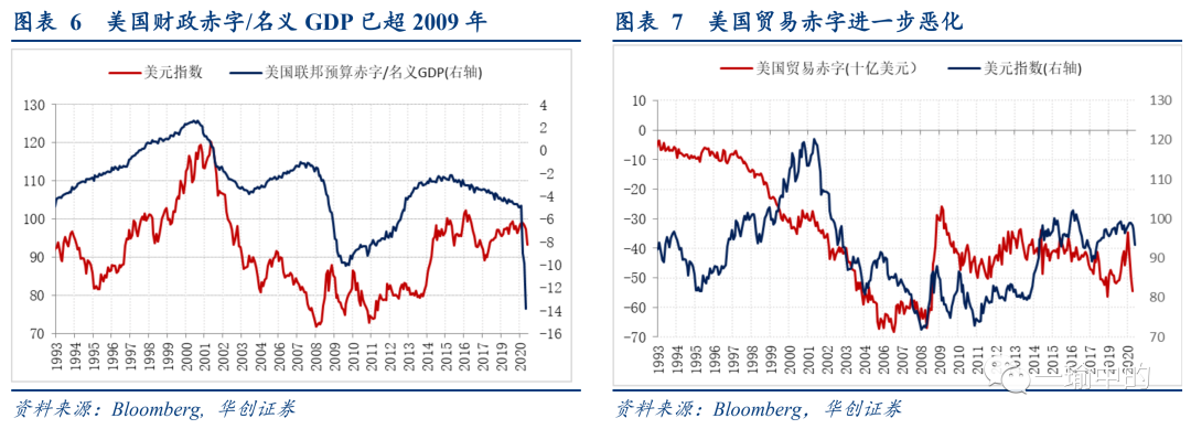 更关键的是,本次美元破位很可能已确认了美元新一轮长熊的周期背景,而弱美元环境向来是黄金乃至大宗商品整体开启长期牛市的基础。从历史规律看,布雷顿森林体系崩溃后,以名义有效汇率衡量的美元展现出规整的“10年熊,6~7年牛”周期,上一轮美元上行周期从2011年开始,至2017~2018形成双顶已历7年。按此规律,美元自2017年以来已进入新一轮10年长熊,本次美元破位下跌可视作对该周期背景的一次重要确认。从基本面看,财政与贸易“双赤字”的加剧是美元长熊的催化剂。本质上,“双赤字”的加剧代表了美元信用的透支:贸易逆差代表过度消费,过程中输出的美元通过美元外汇占款国购买美债进一步吸收美国财政赤字,从而美国以消费和财政“双透支”收割全球,但过程中也必须透支美元信用,具体的资产反映就是美元走弱。过去12个月美国联邦预算赤字占名义GDP比例上升14%,水平已超2009年,同时美国贸易赤字进一步恶化,“双赤字”同时加剧使美元长熊周期有基本面支撑;从资产配置角度看,金融危机后由于欧日均实施负利率,大量资金投资美元资产以实现套利交易,而疫情后美联储迅速降息带来美德利差大幅收窄,叠加欧盟复兴基金落地后将发行7500亿欧元的欧盟主权债务,增加了欧盟主权债务的投资范围,对美元资产的投资需求或减弱;从对外政策角度看,当前美国对外政策的不确定性可能会弱化全球对美元资产的投资需求。![]()