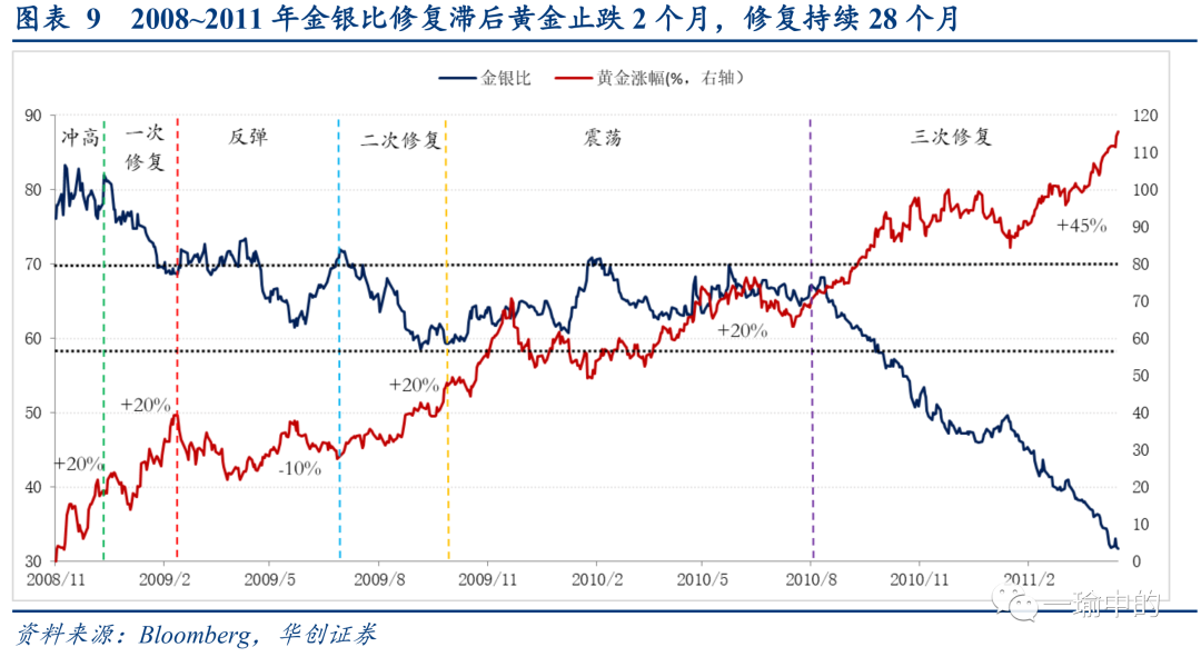 黄金的商品属性与资产属性,可以通过与其他商品与资产的比价显现,成为衡量行情的相对标尺:对于近期金银比的修复,比起 “金银比还能修复多少”,我们更关注“金银明确修复了”这一信号对黄金后市的方向与择时意义。本轮行情之前、2000年以来,金银比突破极值位80后向下修复的情形共有三次,以黄金止跌转涨为起点,金银比修复至低位为终点,分别为:2001年4月~2006年4月、2008年11月~2011年4月的牛市行情,以及2015年12月到2016年7月的反弹行情。观察可归纳为三点:1.整体来看,两次牛市行情中,金银比均经历了“冲高——一次修复——反弹——二次修复——震荡——三次修复”六大阶段,其中冲高与修复阶段黄金涨幅较大,反弹与震荡阶段黄金出现回调。2016年反弹行情持续时间较短,无明显阶段性特征。2.从行情方向看,金银比开始向下修复,标志着行情才刚开始。2001~2006年第一次牛市黄金涨幅150%,其中金银比由82开始向下修复前的黄金累积涨幅45%,时点滞后黄金止跌26个月,后续金银比修复持续34个月,黄金涨幅105%;2008年~2011年第二次牛市黄金涨幅达115%,其中金银比由81开始向下修复前的黄金累计涨幅20%,时点滞后黄金止跌2个月,后续金银比修复持续28个月,黄金涨幅95%;即便是跨度不到8个月的2016年反弹行情(黄金涨幅达30%),金银比修复在开启后仍维持了5个月,黄金涨幅13%。本轮行情中,金银比修复开启与黄金止跌的时点相同(3月19日),至今不到5个月。3.从行情节奏看,金银比快速修复后将反弹,引发黄金回调。两次牛市行情中,金银比第一次修复至中枢区间(图8、9中黑色虚线)上沿期间,黄金涨幅均达20%,但继续向下修复时均有明显反弹,分别引发幅度达18%、10%的黄金回调。本轮行情中,金银比已由3月份高点121修复至7月底的80附近,期间黄金涨幅达34%,且未见明显回调,由于80作为金银比历史极值位的支撑较强,金银比继续向下的遇阻概率在增加。无论是从已有修复幅度还是现有位置判断,本轮金银比修复都已很可能触及了中枢区间。按照两次牛市经验,金银比继续尝试向下修复时将遇反弹,引发黄金回调。结合历史经验判断,3月以来金银比的快速修复进一步确认了本轮行情的长期方向,但短期金银比遇阻反弹概率在增大,黄金可能将先迎回调。![]()