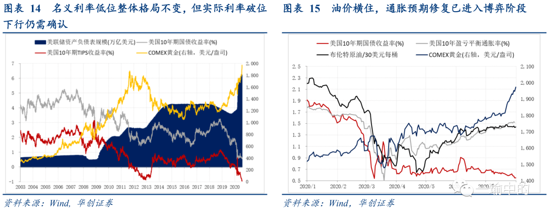 对于黄金的长期定价组合,仍可参考我们在前期报告《黄金只待通胀发令枪》中的论述:“名义利率长期低位+通胀预期长期上行”的潜在组合将引导实际利率持续走低,黄金也有望打开崭新的上行空间。对于黄金的短期定价组合,名义利率方面,由于二次疫情对经济前景的冲击,美联储“不惜一切”的态度相较疫情之初没有根本性改变,意味着名义利率低位的整体格局不变,但根据铜金比的信号,不排除短期反弹可能。通胀预期方面,相较从“负油价”均值回归的高确定性修复阶段而言,当下的通胀预期修复已经进入需等待数据验证的“卖事实”阶段,直观体现在与通胀预期关系密切的油价横住。结合实际利率的位置来看,仍处于2012年前低附近,破位下行仍需确认。“名义利率潜在反弹+通胀预期进入博弈阶段+实际利率破位需确认”的短期定价组合显示黄金短期或有回调需求。![]()