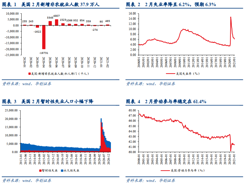 2月美国非农数据大超预期。美国2月新增非农就业人数37.9万人,预期增18.2万人,前值增16.6万人,大幅超出市场预期其中新增私人部门非农就业人数46.4万人。2月失业率为6.2%,低于市场预期的6.3%,前值为6.3%。失业人口中,永久性失业人口小幅下降0.6万人,暂时性失业人口下降51.7万人,劳动参与率与上月持平,稳定在61.4%,可见2月新增就业中多数为前期受疫情封锁措施影响而暂时失业的人口。