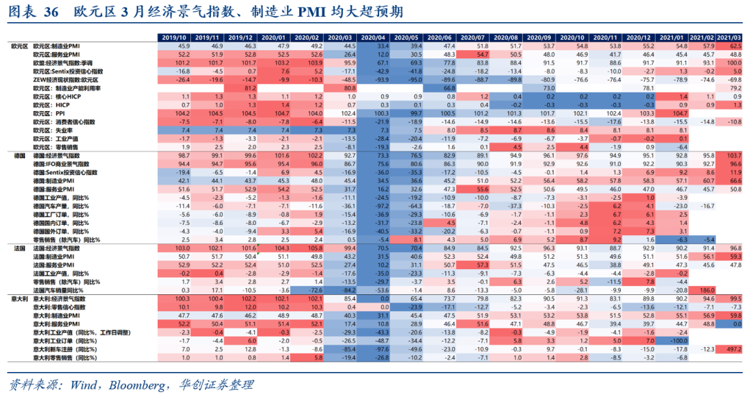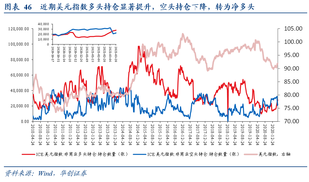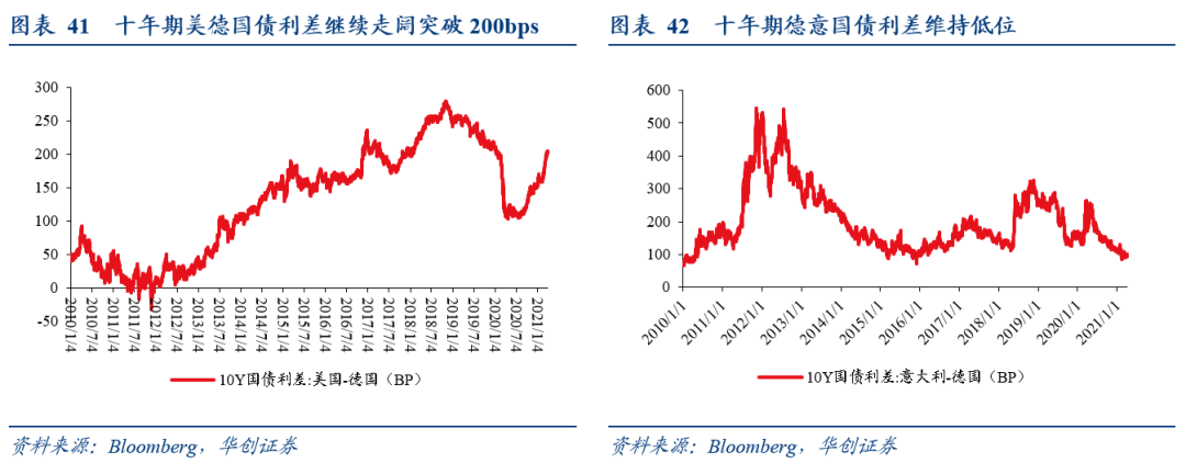 根据目前美欧疫苗接种速度进行线性外推来估算,美国、英国7月初可实现全民免疫,意大利、法国于2022年初可实现全民免疫,德国则将于2022年4月方可实现全民免疫,未来若欧元区国家疫苗供给与接种速度提升,则实现全民免疫的时点或将提前。因此从目前美欧疫苗接种及疫情发展来看,美国持续强于欧元区,因而美元指数也将持续偏强。未来可能的变化在于欧洲疫苗接种速度是否会加速带来欧洲疫情好转预期大幅提升。
