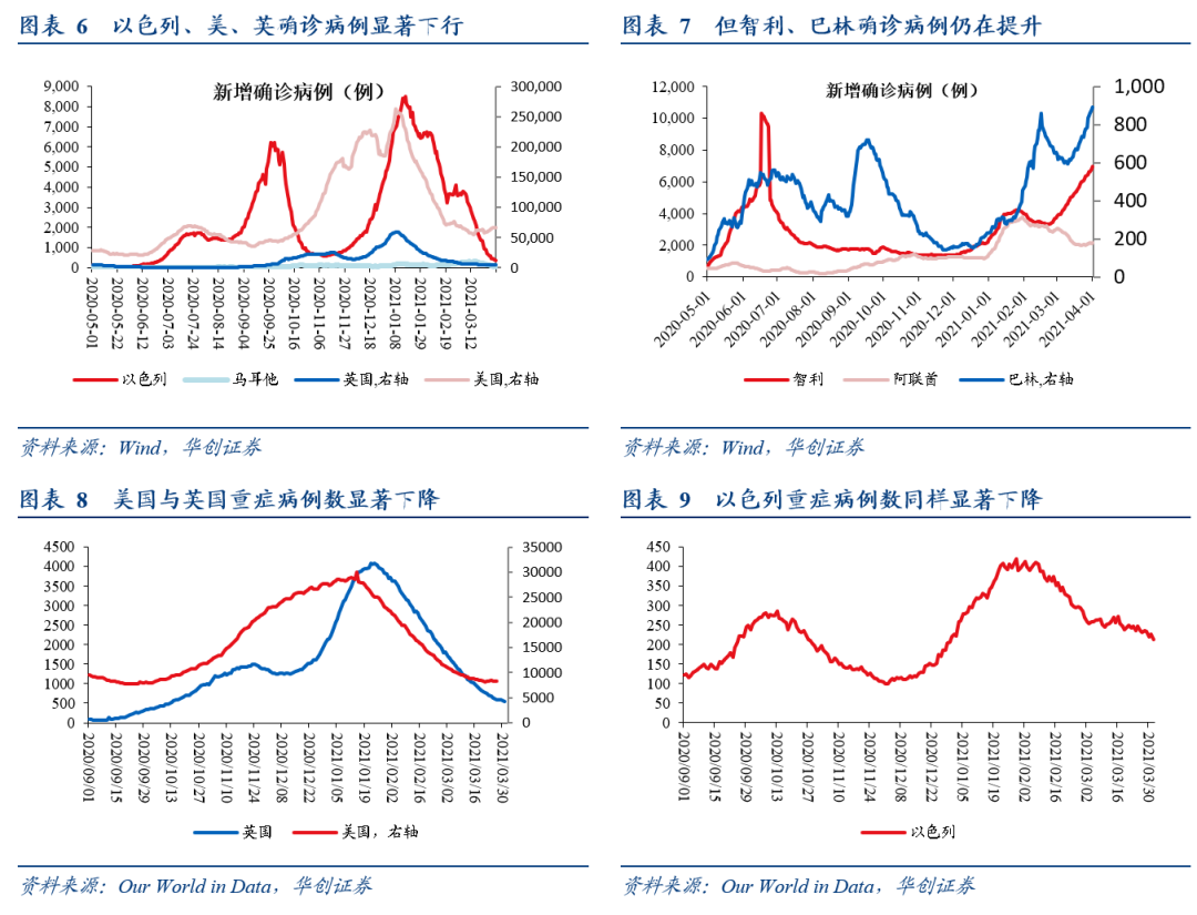 以色列在疫苗接种后,疫情控制良好。目前以色列新增病例主要以英国变异病毒感染为主,根据以色列最大的卫生服务机构Clalit Health Services研究,认为该变异病毒可能是导致重症患者没有如预期那样快速下降的原因。但值得乐观的是,由于以色列疫苗接种率足够高,目前以色列新冠病毒传染R值已降低至0.61,数值小于1表明病毒传染正在减弱,同时以色列新增病例与重症病例人数均显著下降,且在疫情有效控制情况下以色列经济已基本开放,餐厅等公共场所开放、国内旅行限制基本解除。由此可见疫苗接种比例足够高的情况下,以色列有效控制了变异病毒,未出现病毒快速爆发的情况(R值大于1)。