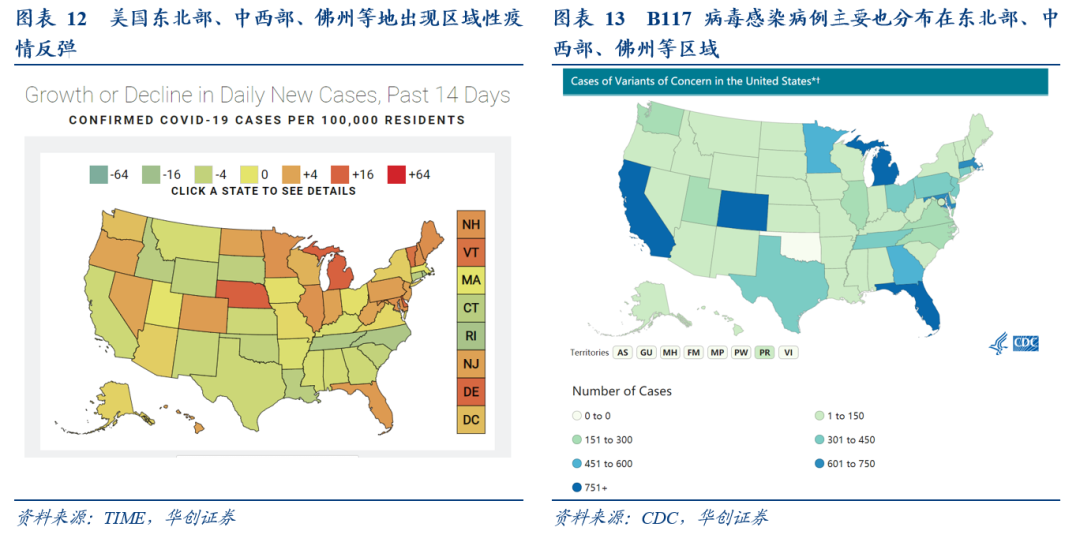 2、变异病毒影响下美国出现区域性疫情反弹。从区域分布来看,此轮疫情反弹目前主要分布在美国东北部、中西部、佛罗里达州等区域,而根据CDC统计,疫情反弹较为严重的州恰好也正是B117变异病毒感染人数较多的州,其中佛罗里达州、密歇根州、科罗拉多州、加利福尼亚州均是B117变异病毒病例的集中州。目前B117病毒是美国变异病毒中感染比例最高的种类,因此可见此轮美国疫情的区域性反弹或与B117变异病毒的传播关系较大。