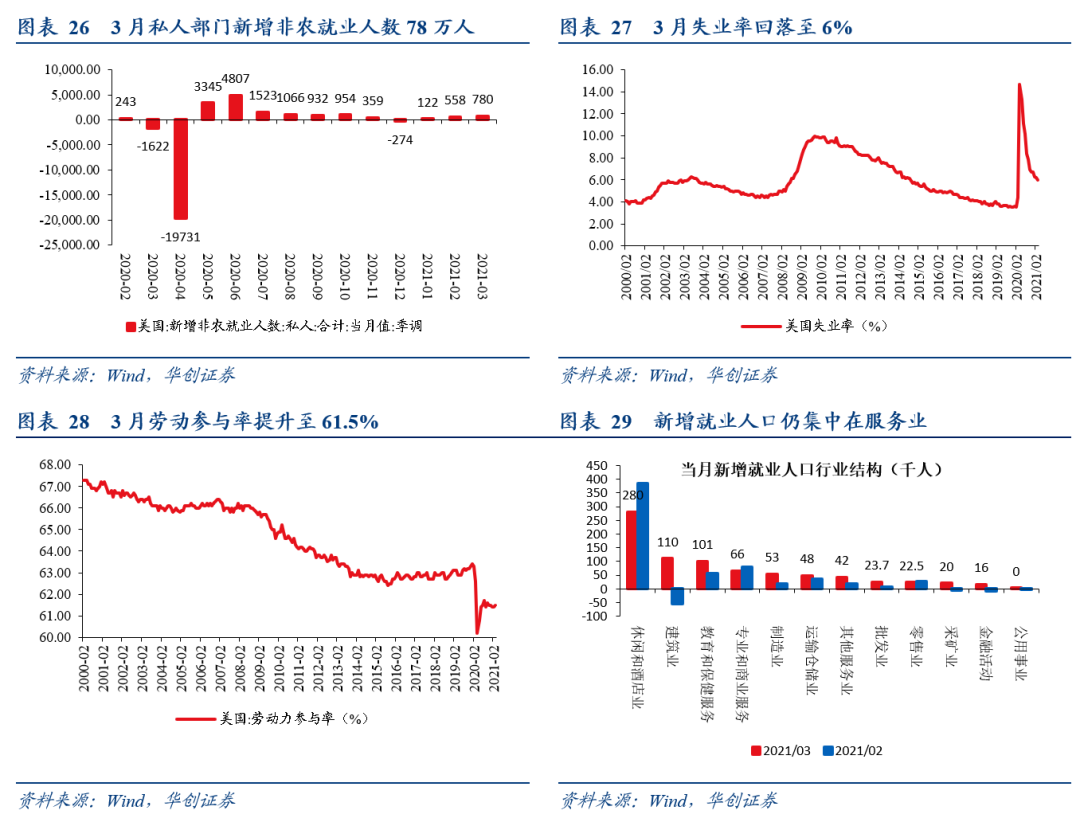3月美国非农数据再度超预期。美国3月新增非农就业人数91.6万人,预期增64.7万人,大幅超出市场预期;其中新增私人部门非农就业人数78万人。3月失业率降至6%,创去年3月以来新低。失业人口中,永久性失业人口小幅下降6.5万人,暂时性失业人口下降20.3万人,劳动参与率较2月提升0.1个百分点至61.5%,3月就业结构也有所改善。