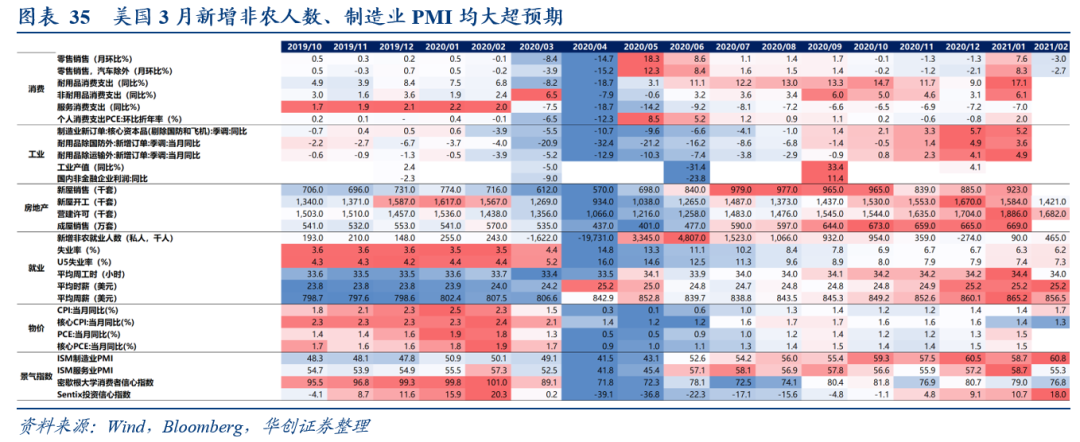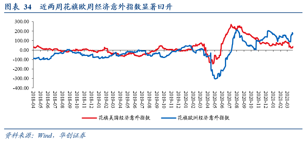 消费数据方面:美国出行指数继续回升,达到疫情前60%的水平,美国餐厅就餐活动继续回升,达到疫情前80%的水平,同时美国近2周零售销售增速与电影票房均显著提升,消费端改善显著。工业生产方面:铁路交通运输量与用电量均超出2019年水平,3月末粗钢产量回升至2019年平均水平的84%。3月20、27日WEI指数大幅回升至4.51、7.25。