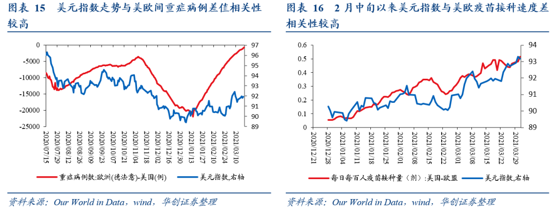 美元指数对美欧重症病例差值、美欧疫苗接种速度差相关性较高。2020年下半年以来,美元指数与欧美重症病例差值之间的相关性一直较高,当美国重症病例数量增速高于欧洲时,美元指数走势也相对偏弱,这一相关关系目前依然存在。同时,2021年2月中旬以来,美元指数与美欧疫苗接种速度差的相关性也显著提高,美国疫苗接种速度快于欧洲时美元指数也相对偏强。