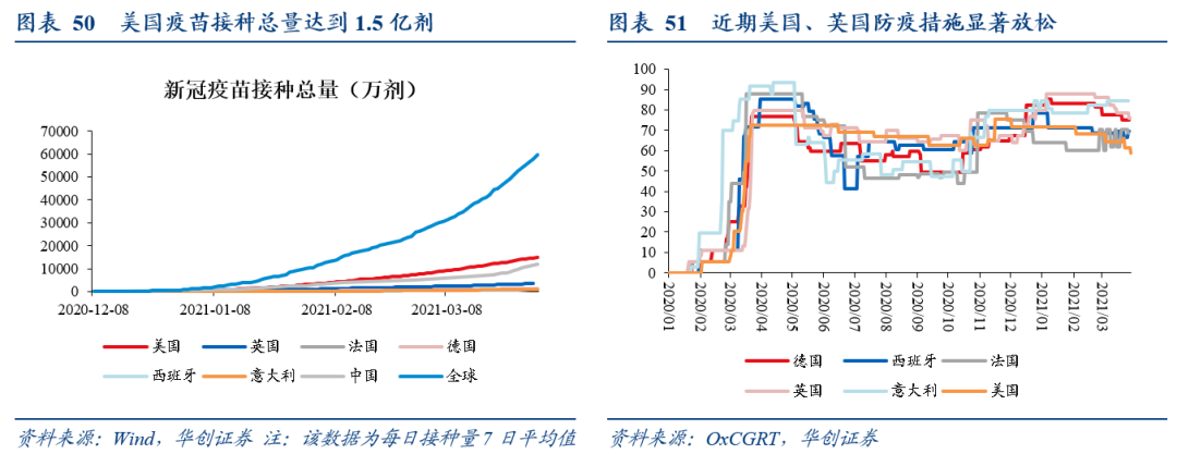 近期美欧新增病例数量回升,美欧防疫措施加强,而英国逐步放松限制。德国总理默克尔和法国总统马克龙宣布加强本土限制措施,德国延长封城至4月18日,法国从4月3日起进入4周的全国封锁期,以遏制第三波新冠疫情。英国政府正逐步放松限制措施,英格兰地区从3月29日起结束居家令,其他地区正在制定放松封锁的计划。