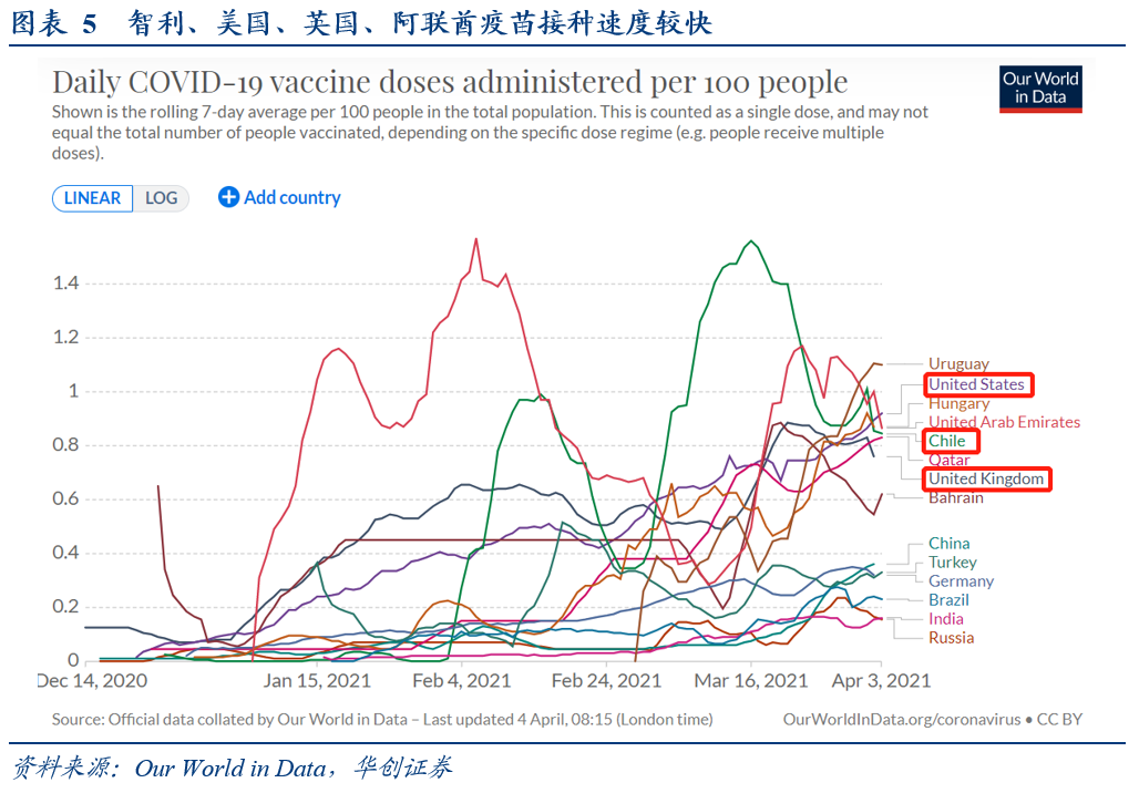 疫苗覆盖比例上,以色列、英国、智利、美国至少接种一剂疫苗的覆盖比例较高,分别达到60.7%、46.3%、36.3%、31.6%;疫苗接种速度上,美国、阿联酋、智利、英国接种较快,每日每百人接种剂数分别为0.92、0.87、0.84、0.76。