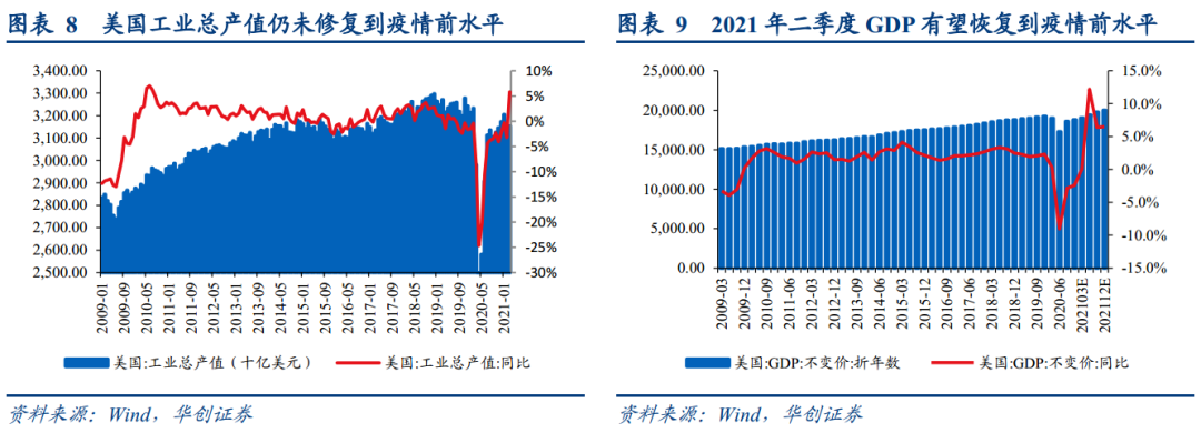综合来看,目前通胀与失业率均已修复至2013-2014年同期水平,同时伴随企业利润的真实改善。但由于近期疫情反复带来工业生产、服务业修复前景仍不明朗,并导致就业市场仍无法完全摆脱疫情的冲击,劳动参与率仍低、服务业等受疫情冲击较大的行业就业人口修复比例仍较低,因此美联储下一步的政策转向时点仍需继续跟踪疫情发展情况,可能需要在疫情控制前景更明朗的前提下,美联储才会逐步明确政策转向的预期。