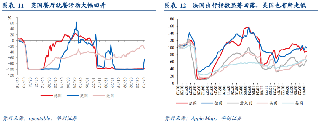 消费数据方面:近两周英国餐厅就餐活动出现大幅回升,不过随着美欧疫情的再度反弹,出行指数有所回落,美国电影票房收入也出现回落,但美国零售销售仍偏强,4月10日当周美国红皮书商业零售同比+13%。工业生产方面:近期美国用电量季节性回落但基本持平于正常年份水平,近两周WEI指数持续高企。![]()