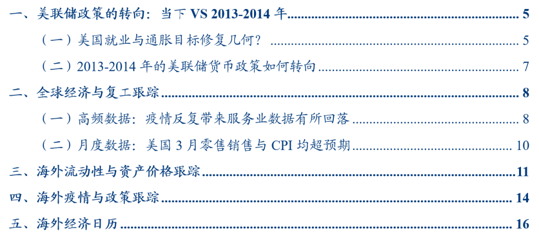 2020年12月美联储议息会议纪要指出:一旦货币政策委员会在实现最大就业和价格稳定目标方面取得实质性进展,就可以开始逐步减少购买,之后的过程大致可以遵循2013-2014年大规模购买计划期间实施的顺序。而在今年的2次会议纪要中,同样表示资产购买将维持到就业和通胀目标取得实质性进展。由此可见,美联储未来货币政策将呈现两个特点,一是资产购买规模调整的依据将很大程度上将由就业和通胀水平决定;二是货币政策调整的路径将参照2013-2014年的经验。因此本文试图回答两个问题:1、美国当前的就业与通胀目标达到何种程度?2、2013-2014年美联储货币政策经历了怎样的调整?美国通胀有望达到美联储政策目标水平。2021年2月美国核心PCE同比+1.4%,而2013-2014年核心PCE同比增速均值1.5%左右,可见目前美国通胀水平已经与2013-2014年水平相持平。同时,二季度起随着原油价格低基数,以及房价、进口价格指数、居民薪金等水平均提升,核心PCE将有望进一步提升,目前彭博一致预期显示2021Q2/Q3/Q4核心PCE预期+2.2%/+1.8%/+2.0%,2022年预期值达到+2%,即美国通胀指标有望达到美联储政策目标水平。失业率略低于2013年末,但考虑劳动参与率的调整后失业率略高于2013年,反映当前劳动力市场仍弱于当年。目前,美国官方失业率数据已降至6%,2013-2014年均值为6.7%左右,2013年末为6.7%,因此从官方数据来看,目前美国失业率已优于2013年末。但参考美联储理事Brainard对失业率的看法 ,考虑到疫情发生后美国有400多万人口退出劳动力市场,导致劳动参与率大幅下降,如果考虑上这部分人口后,美国当前的失业率可达到8.6%,如果再考虑分类错误的问题(即部分失业人口被划分入休假人口),则实际失业率接近10%。因此从这一视角来看,目前美国就业市场尚有修复空间。经济基本面状况:疫情控制仍对经济修复形成不确定性。目前美国经济结构中,商品零售业、房地产业均已超出疫情前的水平,同时2020Q4数据显示企业利润也已超出疫情前水平。但由于疫情反复的影响,美国经济结构中仍有偏弱的部分:美国工业总产值尚未回升至疫情前水平(3月总产值3.15万亿美元,而2019年均值3.24万亿美元),且就业人口结构上,休闲和酒店业等受疫情冲击较强的服务行业目前就业人数修复仍较弱,仅回升到疫情前80%的水平,反映经济基本面当前仍受疫情前景不确定性的影响。综合来看,目前通胀与失业率均已修复至2013-2014年同期水平,同时伴随企业利润的真实改善。但由于近期疫情反复带来工业生产、服务业修复前景仍不明朗,并导致就业市场仍无法完全摆脱疫情的冲击,劳动参与率仍低、服务业等受疫情冲击较大的行业就业人口修复比例仍较低,因此美联储下一步的政策转向时点仍需继续跟踪疫情发展情况,可能需要在疫情控制前景更明朗的前提下,美联储才会逐步明确政策转向的预期。2013-2014年为金融危机后美联储货币政策的转折点。2013年末开始美联储正式缩减资产购买规模,2014年9月美联储发布了《货币政策正常化原则和计划》,开始货币政策正常化操作。2014年10月美联储停止扩表,并将资产负债表中到期金融资产的本金进行再投资,从而维持资产负债表的规模。2013年中起美债实际收益率重回正区间。10年期美债收益率自2009年期趋势下行,2011年末进入负利率区间,2013年中随着美联储明确释放货币政策转向预期,美债实际收益率触底回升,并重回正区间,此后2014-2018年期间美债实际利率咋0%-1%区间震荡。2020年疫情发生以来,美债实际利率再度降至负利率区间,后续若货币政策开始转向,则实际利率走势或也将触底回升,呈现上行趋势。报告目录