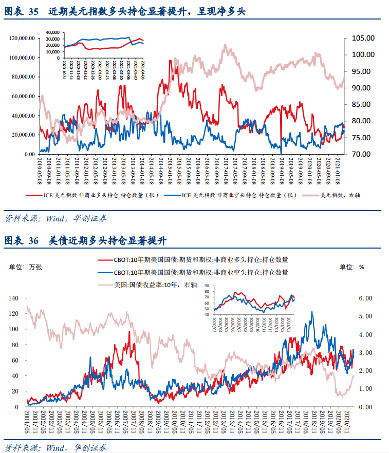近期美元指数与美债收益率均呈现下行趋势,背后主要原因可能在于:1、前期市场对经济修复与通胀预期过于乐观,带来美债利率快速上行,而近期经济数据发布后,预期落地,美元与美债收益率进一步上行或需更多的催化因素。2、近期美欧疫情反复影响了市场复苏交易的热度,尤其是欧洲疫苗供应速度提升后,近期疫苗接种速度提速,边际上优于美国,带来欧元资产相对偏强。![]()