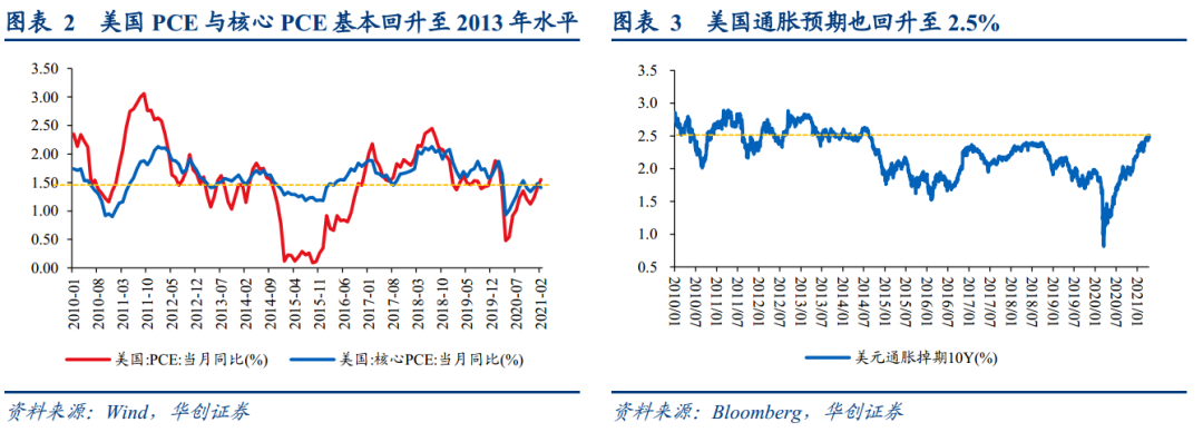 美国通胀有望达到美联储政策目标水平。2021年2月美国核心PCE同比+1.4%,而2013-2014年核心PCE同比增速均值1.5%左右,可见目前美国通胀水平已经与2013-2014年水平相持平。同时,二季度起随着原油价格低基数,以及房价、进口价格指数、居民薪金等水平均提升,核心PCE将有望进一步提升,目前彭博一致预期显示2021Q2/Q3/Q4核心PCE预期+2.2%/+1.8%/+2.0%,2022年预期值达到+2%,即美国通胀指标有望达到美联储政策目标水平。另外,美国目前通胀预期回升至+2.5%,也提升至2013-2014年中枢水平。