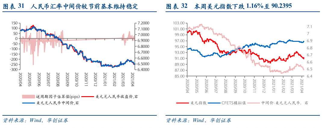 本周美元指数下跌1.16%至90.2395,人民币兑美元中间价较节前基本保持稳定。本周发布4月外储数据,4月末外汇储备3.1982万亿美元,环比增加281.51亿美元,黄金储备美元计价余额为1107.32亿美元,前值1059.33亿美元。