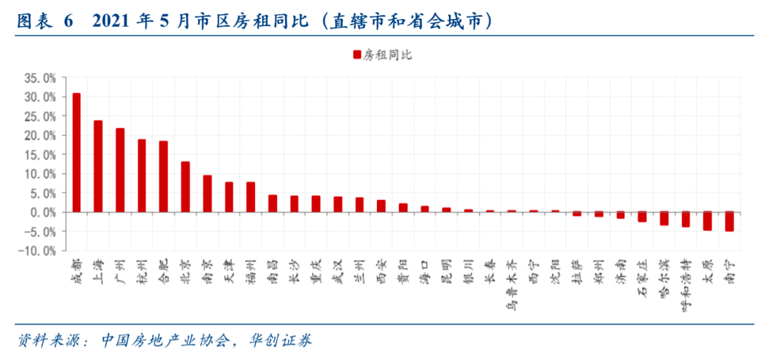 伴随上游原材料价格和运输价格屡创新高, 4月开始,涨价全面扩散的信号进一步增强,下游行业“涨”声四起,消费品涨价蠢蠢欲动。我们试图跳出CPI指数,观察各行业的价格变动情况,以帮助市场在指数之前率先感知涨价的温度。可以看到,4月开始,居民消费“衣食住行”四大方向,除了着装,都出现了涨价信号。首当其“涨”的,是居民的住房成本。根据中国房地产业协会,截至4月,全国直辖市和省会城市中,有11个城市市区二手房价同比超过10%,6个城市市区房租同比超过10%。其中房价和房租同比均超过10%的城市分别为:广州(房价同比34.8%、房租同比21.6%,下同)、合肥(33.4%、18.3%)、上海(27.8%、23.7%)、成都(20.6%、30.6%)、杭州(19.6%、18.6%)。(注:深圳无公开统计数据)