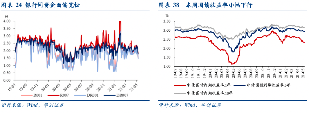 截至5月8日,DR007收于1.7686%,DR001收于1.4703%,较上周环比分别变化-57.79bps 、-79.21bps。1年期、5年期、10年期国债收益率分别报2.3193%、2.9369%、3.1582%,较上周环比分别变化-3.98bps、-2.46bps、-0.58bps。央行本周公开市场操作净回笼300亿,资金面边际宽松,DR007利率下行。在5月6日500亿逆回购到期主要是因为五一假期里堆积过多的逆回购到期所致,当天央行延续100亿的逆回购操作,央行近期稳定操作策略预计不会改变。同时仍需关注5月市场不确定的因素,在地方债和缴税压力下,流动性可能面临收敛。![]()