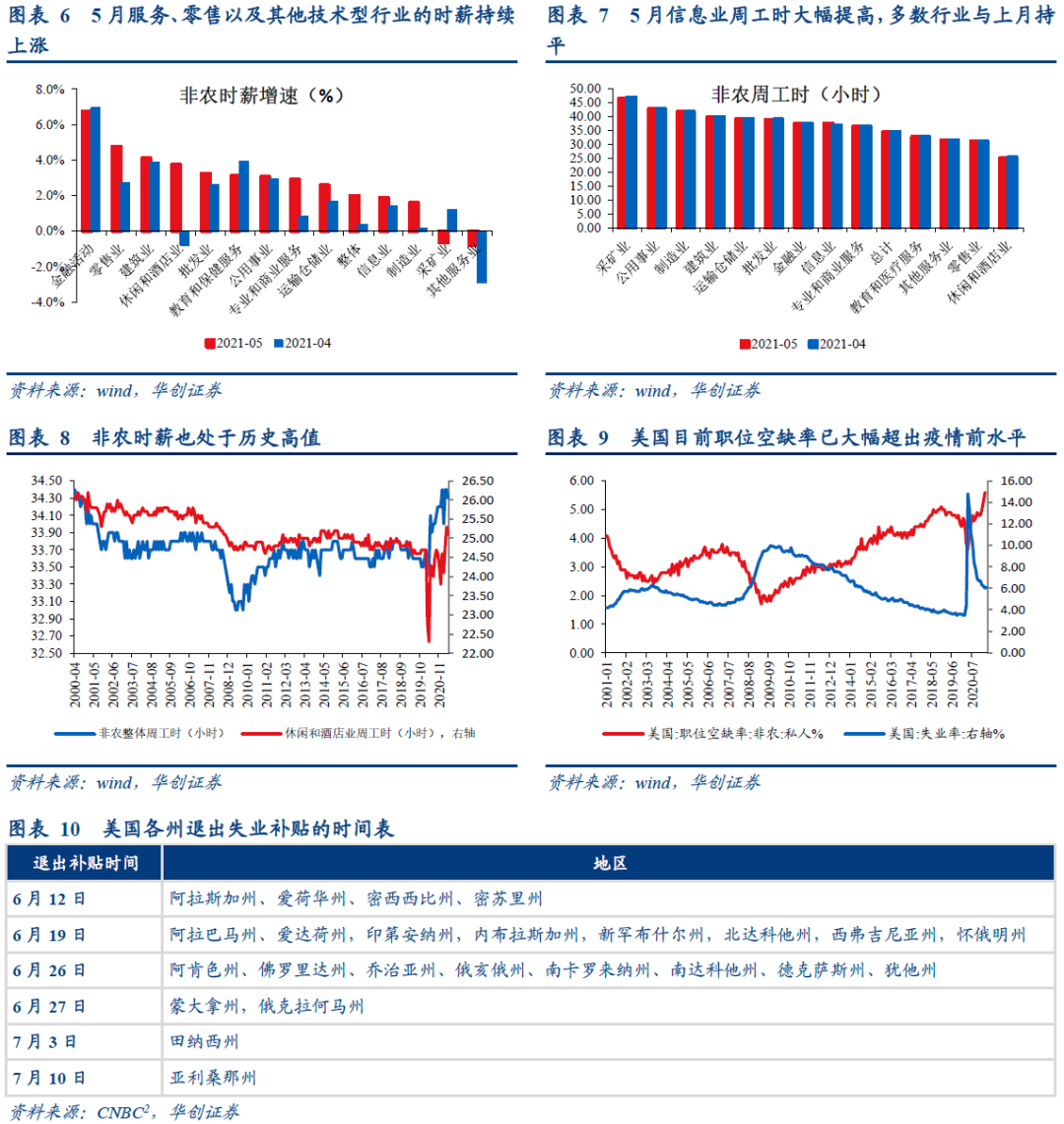 但职位空缺数、时薪与周工时数据均提示美国劳动力市场存在结构性短缺。5月服务业(如休闲和酒店业、专业和商业服务、运输仓储业)、零售业与批发业以及其他技术型行业(如信息业、制造业等)的时薪大幅上涨;工时方面,5月多数行业周工时与4月持平,处于历史高值。职位空缺率方面,该指标通常与失业率保持较好的同步关系,反映用人单位招工需求的旺盛程度,目前职位空缺率已大幅超出疫情前水平,反映就业市场存在的劳动力短缺问题。美联储5月褐皮书中也指出,目前美国低技能职位(如餐厅、酒店服务人员),以及熟练销售人员、护士、IT职员和卡车司机等专业技术人员的需求最为强劲,这也造成相关工种的时薪持续提升。