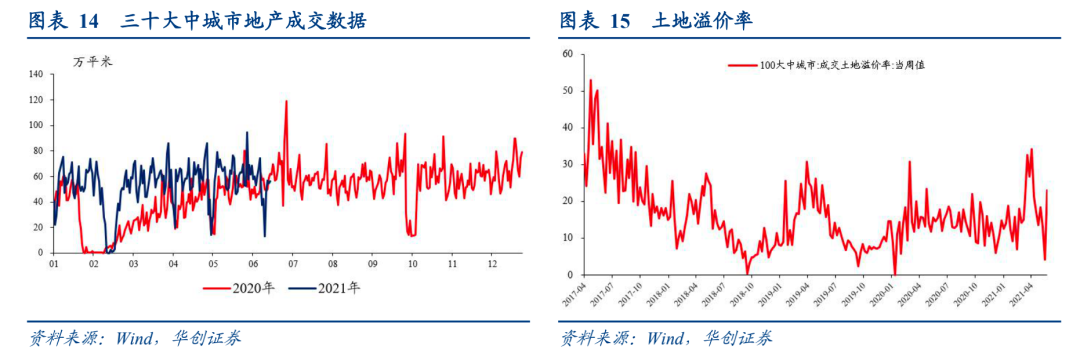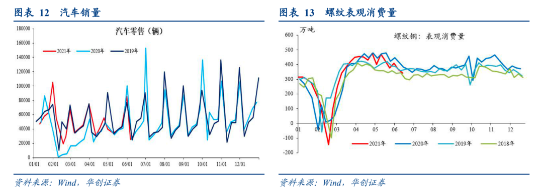 土地方面,6月13日当周溢价率有所回升,达到22.97%。成交面积依然偏低。6月前两周百城住宅类成交面积957万平米,去年同期是1459万平米,2019年同期是1135万平米。1-5月,百城住宅类土地成交面积是8216万平米,不及2019-2020年同期。2020年同期是9945万平米,2019年同期是9554万平米。地产销售方面,本周有所回落。本周三十大中城市地产销售面积两年平均增速降至-6.3%,上周是20.3%。6月截止至18日,两年平均增速为5%,5月是6.9%,4月是7.3%。螺纹表观消费方面,较为低迷。6月18日当周降至343万吨。2020年同期在400万吨左右,2019年同期在362万吨左右。 汽车方面,也很低迷。乘联会数据,6月14日当周,日均零售3.5万辆,2020年同期是3.66万辆,2019年同期是5.05万辆,2018年同期是3.95万辆。![]()