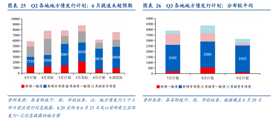 (五)地方债:财政部再评专项债发行放缓,Q3地方债发行计划陆续公布上半年新增专项债发行较前两年有所放缓。截至6月20日,全国地方累计发行新增地方政府债券13881亿元,占已下达限额的33%,2019、2020年1-6月分别完成全年进度71%、59%。其中一般债券4550亿元,占已下达限额的57%, 2019、2020年1-6月分别完成全年进度85%、57%;专项债券9331亿元,占已下达限额的27%,2019、2020年1-6月分别完成全年进度64%、60%。据财政部介绍1-5月财政收支情况时的表述,“今年发行进度较去年同期有所放缓,主要是考虑2020年发行的专项债券规模较大,政策效应在今年仍会持续释放”,该提法和财政部介绍2021年一季度财政收支情况时的表述一致。从6月发行节奏的边际变化看,较5月有所提速,但并未明显超预期:截至6月20日,已知6月25日及以前所有已实际发行+已信息披露的新增专项债共3959亿,较5月有所提速(3520亿),但仍在各地公布的6月发行计划合计(3816亿)附近,未明显超市场预期。从投向看,6月已知用途的新增专项债中,棚改和保障安居工程(12.6%)、城乡基础设施(10.9%)、市政产业园(10%)占比居前。发行计划更新:各地陆续披露Q3地方债发行计划,各月新增专项债计划分布较平均。财政部要求地方财政部门应当在每月20日前披露本地区下月地方债发行计划,在3月、6月、9月和12月20日前披露本地区下季度地方债发行计划。截至6月20日,从14省市已披露的Q3地方债发行计划看,各月新增专项债计划分布较为平均。由于今年新增专项债急于在Q3发完的政策限制目前尚未出现、政策意愿亦不强烈,我们提示发行后倾Q4的程度可能超预期(具体内容详见《【华创宏观】下半年财政的三个判断——5月财政数据点评》)。![]()