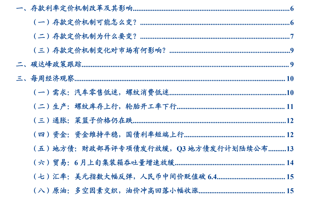 最后,落地到资产。对债市利率而言,决定利率中长期趋势的还是基本面,5月经济数据的小幅走弱及通胀数据的攀高,初步验证了我们对于经济走向“类滞胀”的观点,利率在这一时期对于经济增长和通胀变化表现脱敏,多呈震荡走势。短期内,我们仍然认为利率已经过了最佳的波段机会,当前3.12%左右的水平向下空间有限,且在5月份资金面偶然的被动式宽松后,DR007基本已经回到了政策合意水平,未来大概率围绕2.2%波动。本次定价机制变化虽然可能带来银行同业负债压力,但是考虑到需要进行价格调整的存款规模有限,预计影响较小。对权益而言,部分企业和居民的资金可能转向表外资管产品,甚至直接转向股票市场,带来小部分增量资金。但我们仍然提示超额流动性压缩、通胀上行的背景下,权益市场下半年依然面对压估值的可能性。1、6月16日,国家发展改革委环资司在北京召开部分地区碳达峰碳中和工作座谈会:“会议要求,当前各地区要把坚决遏制‘两高’项目盲目发展作为抓好碳达峰、碳中和工作的重中之重。要坚决贯彻执行党中央、国务院决策部署,全面排查本地区在建‘两高’项目,科学稳妥推进拟建‘两高’项目,深入推进存量‘两高’项目节能改造。要严格实施节能审查和环评审批,对于不符合国家产业规划、产业政策、‘三线一单’、产能置换、能效标准、煤炭消费减量替代和污染物排放区域削减等要求的“两高”项目,要坚决拿下来。要直面问题、严格把关,严肃查处违规上马‘两高’项目问题。各地区要强力推进能耗双控,确保完成今年全国能耗强度降低3%左右目标。”