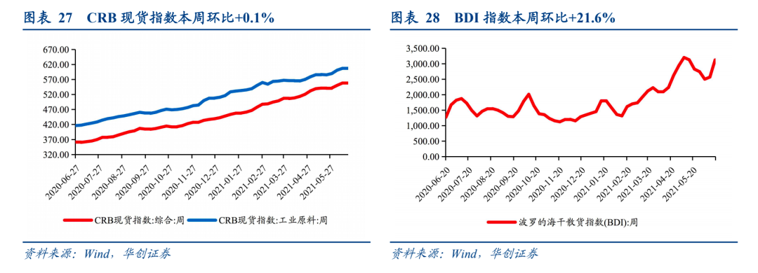 本周CRB现货指数环比+0.1%,工业原料价格指数环比-0.05%,大宗商品价格本周大致持平;BDI指数环比+21.6%,本周显著回升;国内出口集装箱运价指数继续创新高,综合指数环比+3.4%,其中美东航线、欧洲航线指数环比+7.9%、+4.3%;上海进口干散货运价指数环比+12.4%,本周大幅提升。根据中港协数据,6月1日-10日八大枢纽港口集装箱吞吐量同比+2.3%,前值+4%,其中外贸吞吐量同比-1.6%,前值3.9%,外贸同比回落与深圳港受疫情影响吞吐量同比减少有关。大宗商品方面,6月上旬重点港口原油吞吐量同比-0.8%,前值-10.7%,金属矿石吞吐量同比+11.2%,前值+1.3%。