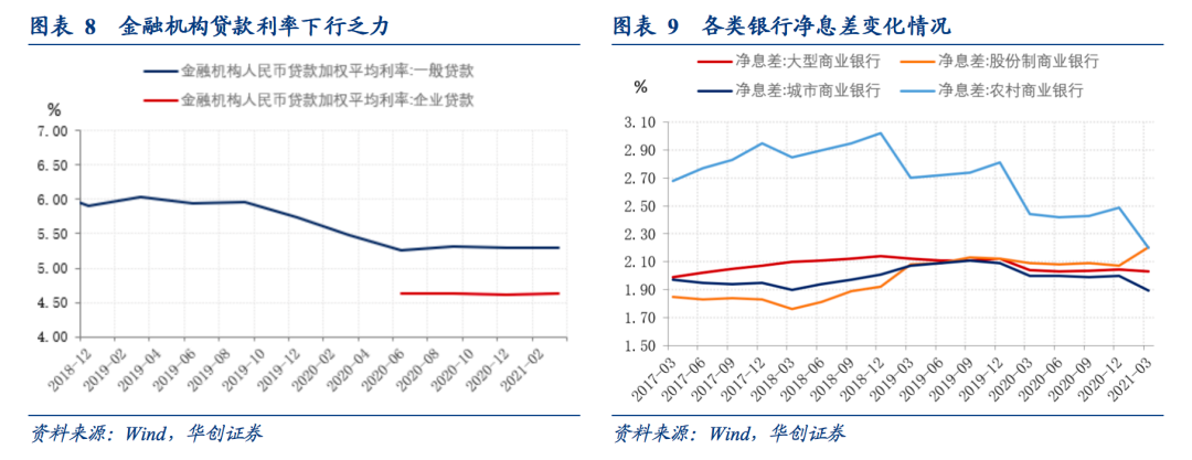 最重要的是,商业银行净息差收窄的压力已经阻碍了贷款利率的进一步下行,负债成本压力的缓和有利于银行进一步让利实体。2021年一季度,金融机构一般贷款加权平均利率僵持在5.3%,企业贷款加权平均利率还小幅抬升了2bp至4.63%。在这背后,一季度商业银行净息差继续压降至2.07%,中小行压力尤大,城商行和农商行净息差已达历史低位。我们认为,净息差继续压降的原因,一是2021年部分按揭贷款开始重定价利率有小幅下调,二是信贷结构的持续调整增加了银行资产端的压力(比如房地产贷款集中度要求、经营贷流向调查)。![]()
