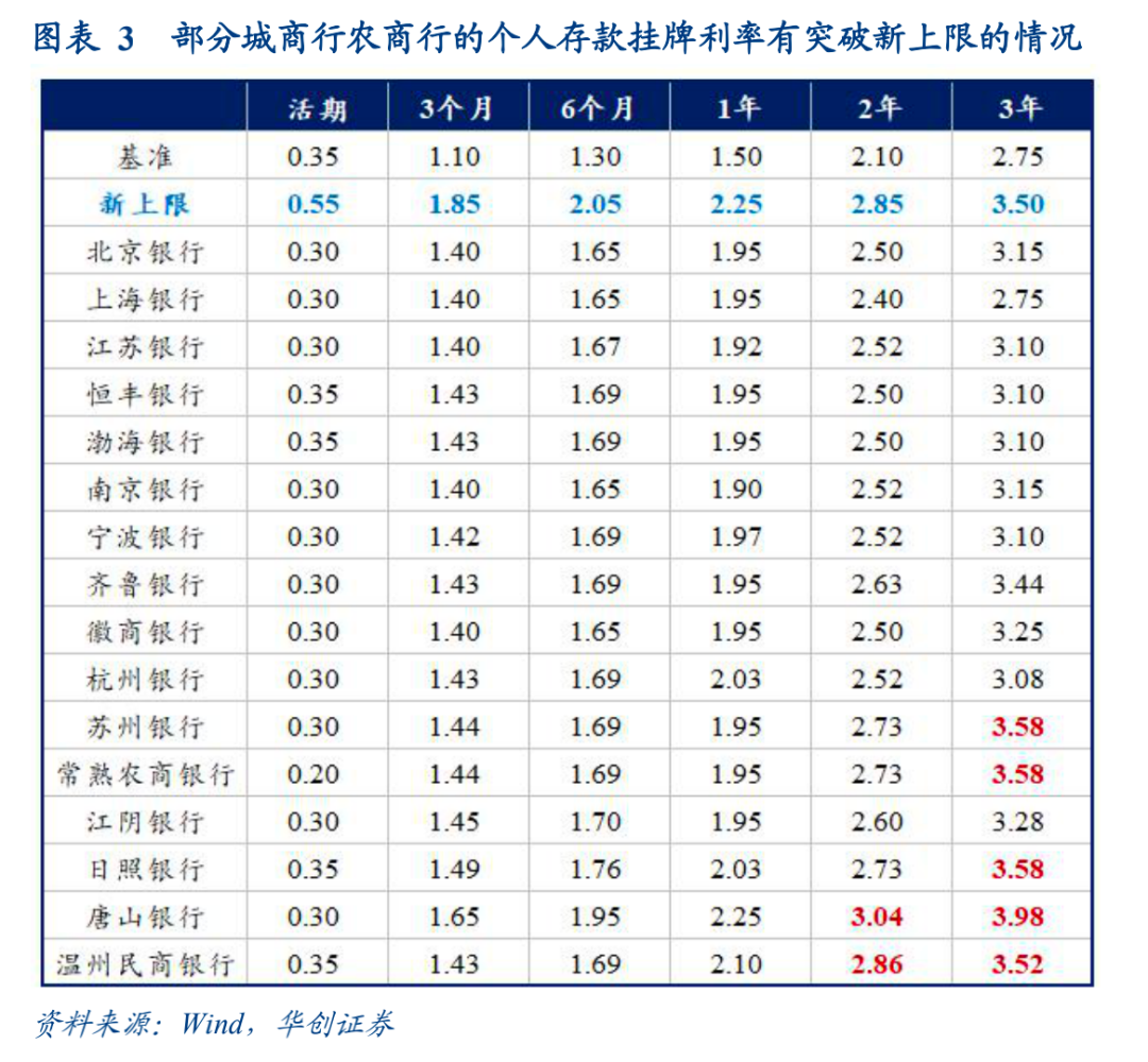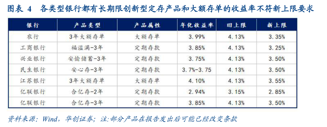 截至目前,央行尚未公布优化存款利率自律管理方案的具体内容,但据新闻媒体,本次方案拟将商业银行存款利率上浮的定价方式,由现行的“基准利率×倍数”改为“基准利率+基点”,在转换定价方式的同时,对不同类型的商业银行设置不同的最高加点上限。据财新网:1)对于活期存款,四大行利率不高于基准利率加10BP,其他机构不高于基准利率加20BP;2)对于3个月、6个月、1年以及3年期定期存款,要求四大行调整后的利率不高于基准利率加50BP,其他机构不高于基准利率加75BP,5年期定期存款没有同期限基准利率,利率上限参考3年期;3)对于大额存单,要求大行调整后的利率不高于基准利率加60BP、其他机构不高于基准利率加80BP。假如存款利率定价方式转变为“基准利率+基点”,哪部分存款受影响较大?以挂牌利率定价的定期存款,四大行和股份行均不受影响,部分中小银行长期定存挂牌利率可能需要小幅调降,比如日照银行3年个人定存挂牌利率为3.575%,温州民商银行3年定存挂牌利率3.52%,均小幅超出了新上限3.5%。差异化定价的各类创新型定存产品和大额存单,则无论是大行小行,都有一批长期限品种需要下调利率。这里我们在图3中列举了部分例子。![]()