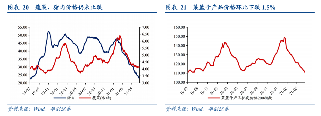 本周菜篮子价格继续下跌。截至6月18日,菜篮子价格200指数收于110.75,较上周环比下跌1.5%。蔬菜价格收于4.08元/公斤,较上周环比下跌1.7%,猪肉价格收于22.77元/公斤,较上周环比下跌4.7%。6月16日,国家发展改革委发布消息称,全国平均猪粮比价为5.88∶1,6月7日~11日,全国平均猪粮比价为5.88∶1,进入过度下跌的三级预警区间。建议养殖场(户)科学安排生产经营决策,将生猪产能保持在合理水平。并表示下一步其将会同相关部门密切关注生猪生产和市场价格走势,及时开展储备调节,促进生猪市场平稳运行。![]()