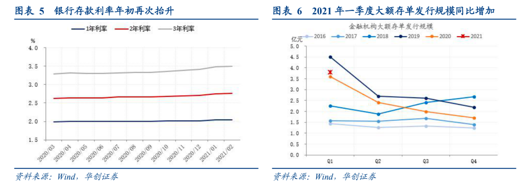 首先,改革是主要目的,调息是小部分存款为满足新机制带来的附加影响,存款定价机制变化并不等于降息。市场部分投资者倾向把存款利率定价机制变化衍生为“降息”,我们认为可能不妥。从实际影响范围看,面临利率调整压力的主要是大额存单和各类创新型定存产品中的长期限品种,规模有限。由于大额存单和创新型存款产品的规模数据缺失,这里我们粗略估算。以大额存单为例,自2015年开启发行以来,截至2021年一季度累计发行规模约50万亿,实际发行期限估计1年占比20%,3年占比50%,那么目前存量规模应当不超过30万亿,对比金融机构存量规模为223万亿,占比在13%以内。