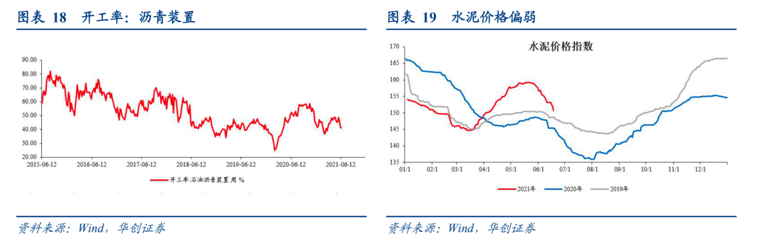 水泥,进入淡季,6月18日当周(相比6月11日),全国水泥价格指数小幅下跌1.6%。 今年水泥价格夏季转跌的时间点略早于2019-2020年。螺纹,本周产量有所增加,达到380万吨/周,此前五周稳定在370万吨左右。唐山钢厂产能利用率依然处于低位,本周是61.47%,上周是61.99%。螺纹钢价格小幅回落。HRB400 20mm:上海现货价格6月18日为5040元/吨,6月11日为5130元/吨。当下螺纹值得关注的是库存较高,截止至6月18日,厂库+社库合计为1084万吨,环比上行36万吨,2020年同期为1056万吨。轮胎、沥青开工率继续下行。6月17日当周,半钢胎开工率为52.7%,上周为58.6%。近四周开工率都在60%以下。6月16日当周,石油沥青开工率为41.1%,连续三周下行。去年同期开工率为52.2%。![]()