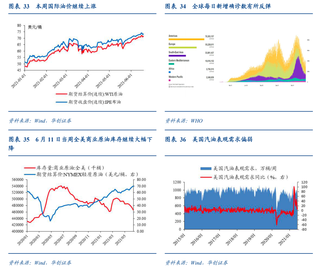 本周国际油价冲高回落,小幅收涨,已连涨四周。伊朗供给压力缓释、库存继续去化推动油价继续上涨,但印度变种毒株持续在全球大范围扩散以及美联储议息会议后美元走强也拖累了油价走势。截至6月18日,布油结算价收于73.22美元/桶,上涨0.83%;WTI原油期货结算价收于71.64美元/桶,上涨1.03%。上周美国商业原油库存继续大幅下降,6月11日当周,美国商业原油库存下降735.5万桶,环比下降1.55%。美国汽油表观需求偏弱,6月11日当周,美国汽油表观需求约964.7万桶/周,环比增长14.5%,较2019年同期水平下降约9.5%。国内方面,汽油和柴油价格继续上涨。截至6月18日,汽油价格收于8231元/吨,上涨0.76%;柴油价格收于6682元/吨,上涨1%。6月上旬,重要石化品价格涨少跌多。苯乙烯、LLDPE、聚丙烯、顺丁橡胶价格延续跌势,分别下跌5.6%、1.3%、1.2%、2.3%;石油苯、聚氯乙烯、涤纶长丝价格小幅反弹,分别上涨1.9%、0.4%、0.3%。![]()