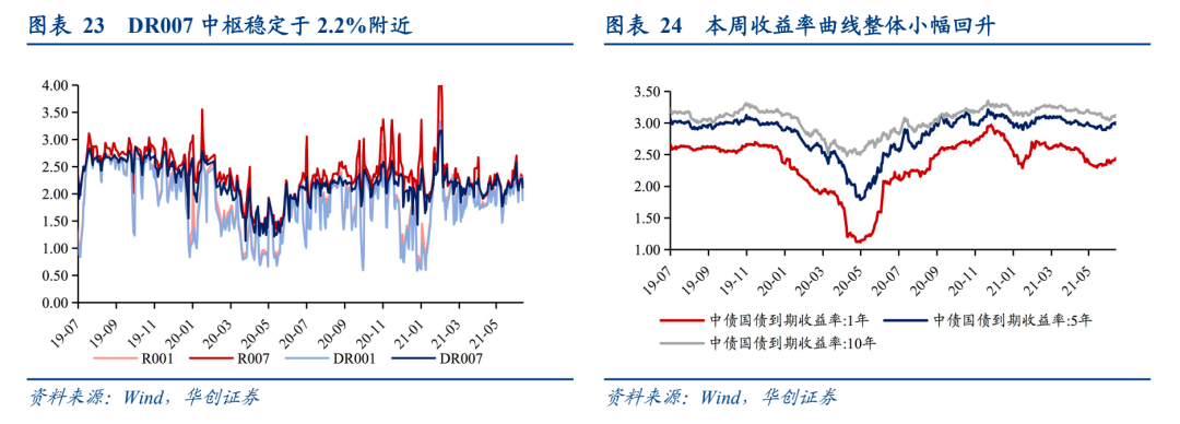截至6月18日,DR007收于2.2039%,DR001收于2.0290%,较上周环比分别变化+5.23bps、+2.78bps。1年期、5年期、10年期国债收益率分别报2.5274%、2.9867%、3.1202%,较上周环比分别变化+8.15bps、-2.18bps、-0.74bps。本周央行公开市场操作资金净回笼100亿(不考虑国库现金定存),资金面维持平稳。周中经济数据发布,5月工增两年平均增速6.6%(前值6.8%),基本符合预期,且地产竣工走强、社零结构改善、服务业小幅好转,收益率曲线整体上行。周五存款利率定价改革将于下周落地的消息传播,反而引发“降息”预期,国债期货异动,长端利率下行。但我们认为市场这一预期或需修正。![]()