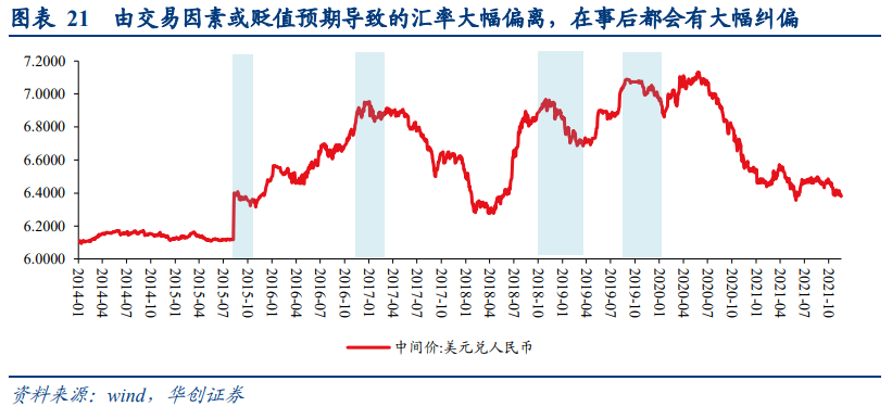 汇率的“偏离程度与纠偏力量成正比”为此次会议新提法,即无论是升值还是贬值,一旦由于交易因素或者预期因素过度偏离基本面,事后都会面临市场自发的纠偏力量或者政策纠偏力量,偏离越远,纠偏越大。2015年以来每次市场预期与情绪大幅波动后,汇率很快触顶回落,且纠偏幅度较大。