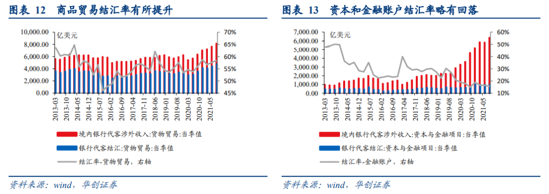基本面衡量实际外汇流动情况,今年外汇流入的“漏损”减少,带来汇率基本面偏强。一则,今年“顺差不顺收”的现象有所改善,导致贸易与投资顺差实际形成的外汇流入更多,可流入银行体系的外汇资金提升,如海关口径商品贸易顺差4260亿美元,银行代客涉外收付款顺差2140亿美元,收款比例达50%,2020年仅39%。2021Q1-Q3银行代客收付款顺差1060亿美元,为历史峰值,反映今年外汇资金实际流入规模较2020年进一步走阔。二则,今年商品贸易结汇意愿显著提升,而更高的结汇需求也推动了人民币走高,如商品贸易结汇率58%,去年则为56%。今年前三季度每季度银行代客结售汇顺差规模达到170-250亿美元,创2014年以来新高,带来人民币结汇较强的基本面。
