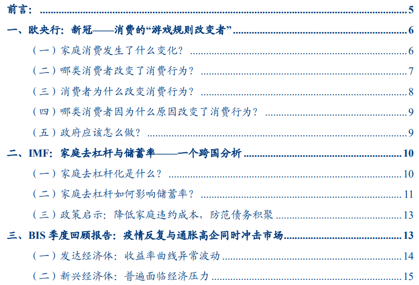 改版后的首期全球央行双周志将聚焦中长期视角下的消费主题。欧央行的工作论文回答了:疫情冲击了居民消费后,这种影响究竟是暂时性的还是永久性的?IMF的工作论文回答了:在居民去杠杆过程中,是否会冲击消费潜力,这对我国居民杠杆率偏高背景下的去杠杆政策颇具指导意义。另外,短期视角下我们梳理了BIS最新一期的季度回顾报告,回顾了Q3以来国债期限溢价、美联储政策紧缩对跨境资本流动的影响。