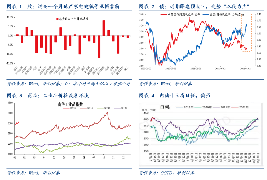 近一个月以来,稳增长预期不断发酵。在资本市场的表现上,体现的较为明显。股票,过去一个月,涨幅较为靠前的包括地产、家电、建筑等稳增长相关板块。债,降息预期下,过于一个月更多以我为主,美债持续上行,但国债利率持续下行。商品,工业品走势偏强,开年以来,价格呈现的是淡季不淡。