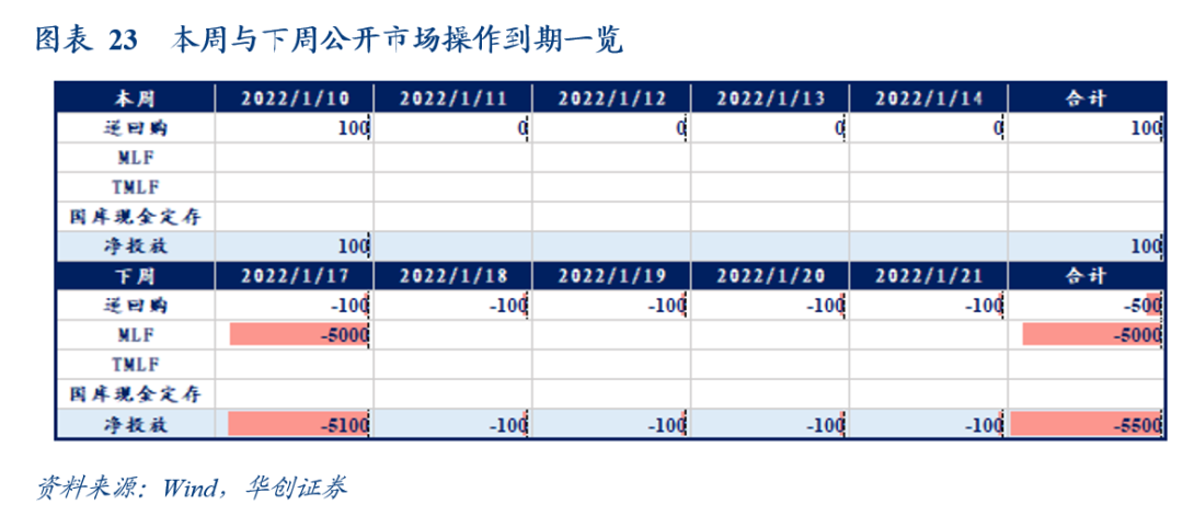 截至1月14日,DR007收于2.2068%,DR001收于2.2013%,较上周环比分别变化+15.85bps、+37.52bps。本周央行净投放资金100亿,下周央行公开市场5500亿资金到期。银行间市场周四流动性明显趋紧,考虑到1月为缴税大月,未来一段时间央行或对资金面进行明显呵护。值得注意的是,周一MLF续作量和价均是市场关注焦点。